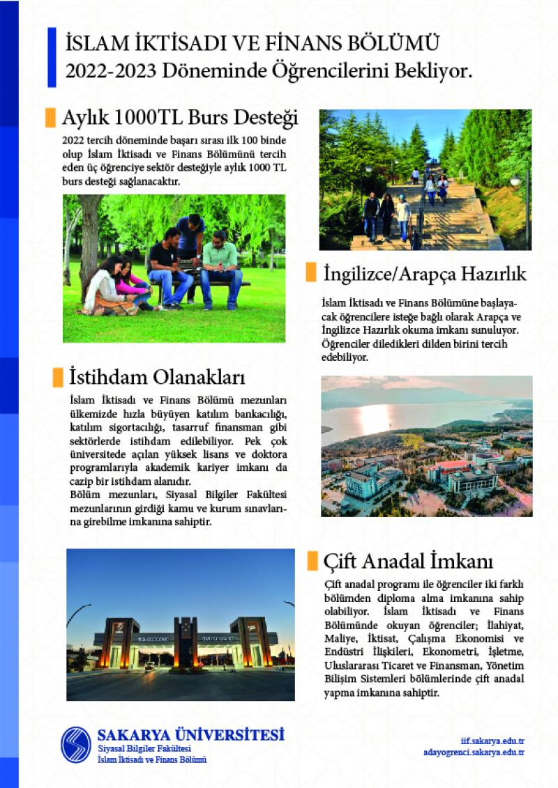 2022 tercih döneminde başarı sırası ilk 100 binde olup İslam İktisadı ve Finans Bölümünü tercih eden üç öğrenciye sektör desteğiyle aylık 1000 TL burs desteği sağlanacaktır.